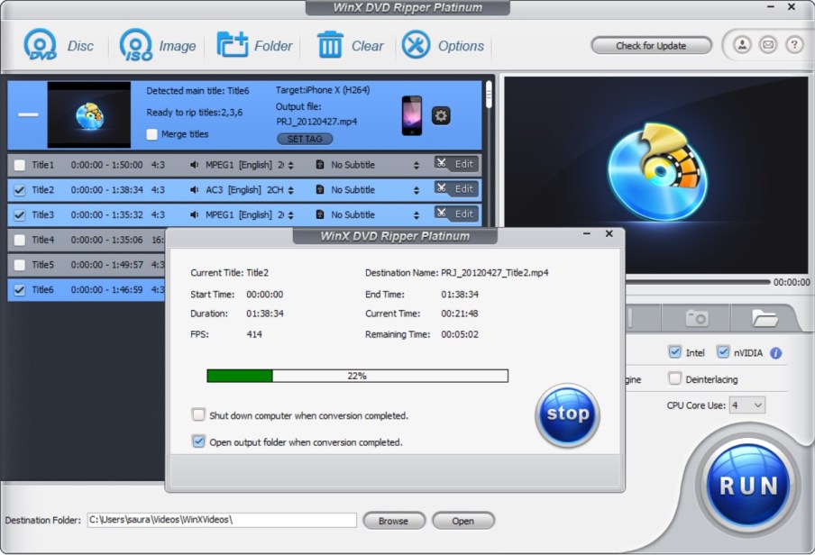 So, as you can see through this tutorial, it is so easy to digitize and rip DVD from WinX DVD Ripper Platinum. You can tweaks settings further to Use High-Quality Engine, enable Deinterlacing, Safe Mode, lower down the number of CPU core (Default: 4) to use by this software, change language, output Folder etc.