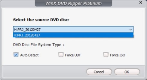 If you want to rip the DVD that you’ve inserted in your DVD drive, upon clicking DVD icon, a popup will appear which let you choose the DVD drive. If you already know the disc file system, you can specify it here by ticking the appropriate tick-box but if you don’t know the file system, just tick “Auto-detect” and press OK.